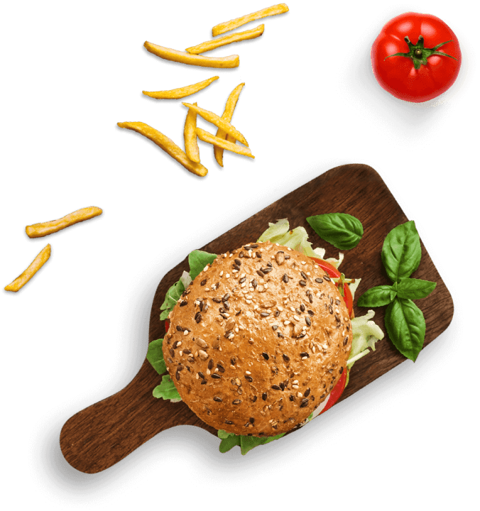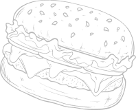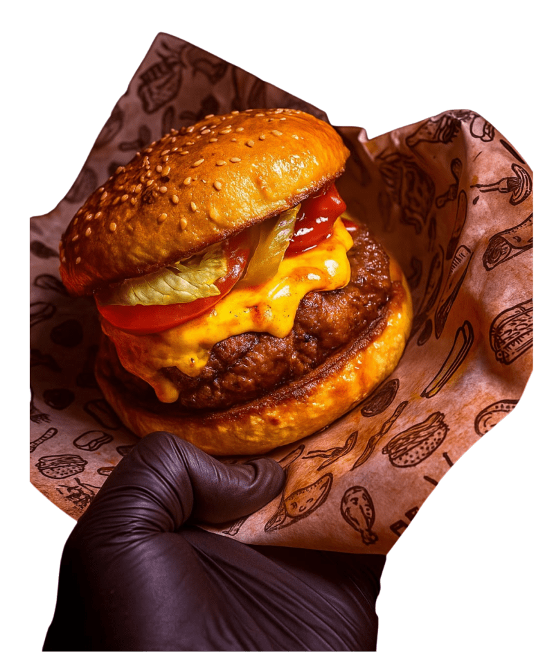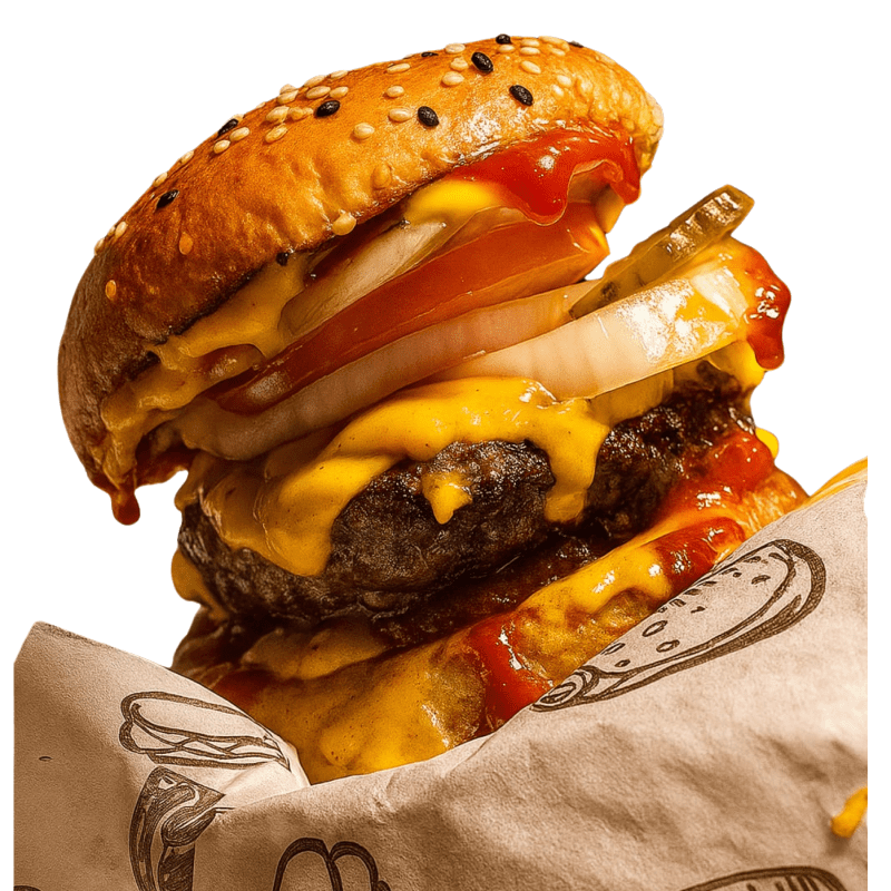 Carne artesanal, pan Brioche, lechuga, tomate, cebolla, mostaza, mayonesa, ranch, pepinillos